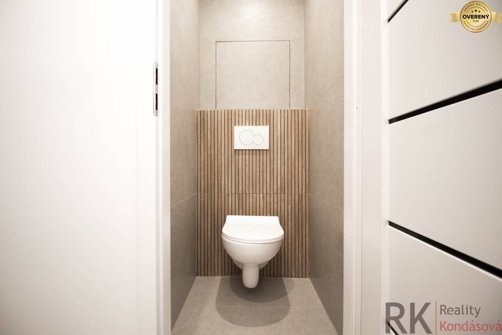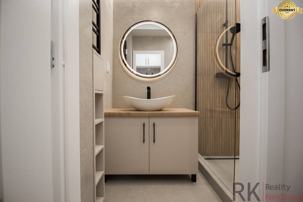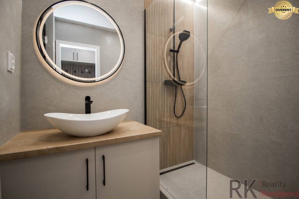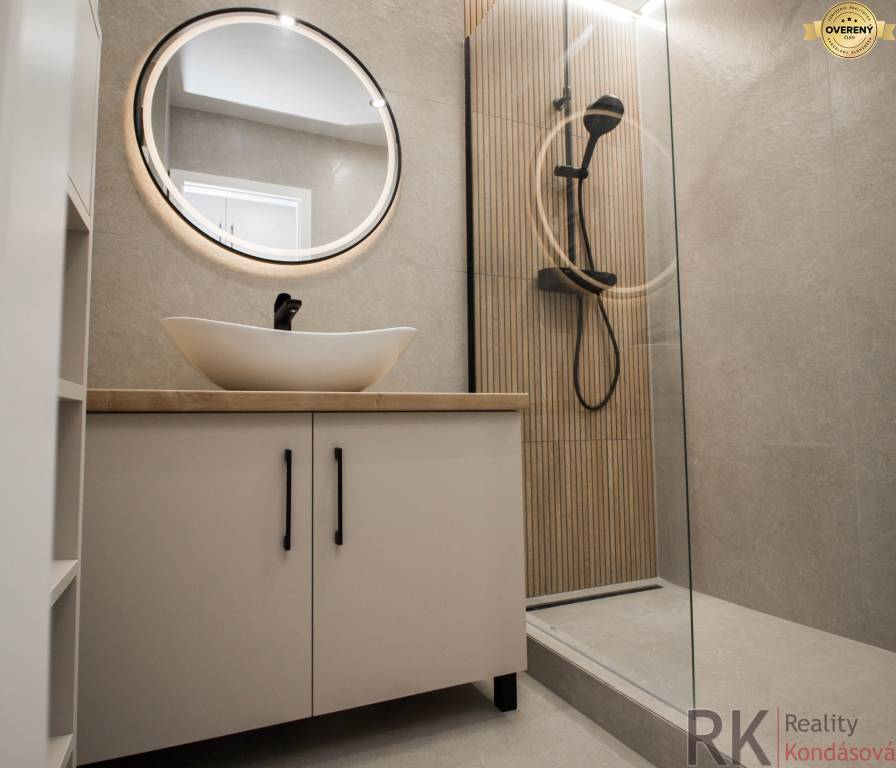 Moderná kúpeľňa je vybavená sprchovacím kútom Walk In, štýlovým umývadlom a kúpeľňovým nábytkom, WC je samostatné s toaletou typu geberit.